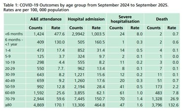 Successive sub-lineages (BA.1, BA.2, BA.4, BA.5) of the Omicron variant circulated during 2022, often associated with an increase in incidence rates (figure 1). Recent strains have been associated with lower rates of serious outcomes (table 1), although age has an important effect on disease sevrity and outcome. Between January and December 2023, successive strains of the Omicron sub-lineage denoted XBB have emerged and were not associated with any major increases in incidence. A novel Omicron strain, denoted BA.2.86 was first detected in August 2023 with a very divergent genome from the predominant XBB strains. By early 2024, no major emergence of BA.2.86 had occurred but a related strain denoted JN.1 had started to predominate and was associated with a modest increase in activity, and became the dominant variant over December 2023 and January 2024. Subvariants of the JN.1 variants have subsequently increased in prevalence with, KP.1/KP.2 (dubbed “FLiRT” variants) and KP.3 (“FLuQE” variants) being associated with an increase in COVID-19 activity in mid-2024.